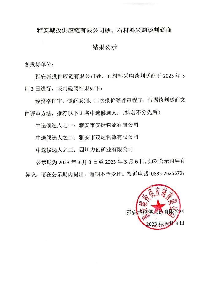 雅安城投供應鏈有限公司砂、石材料采購談判磋商結(jié)果公示