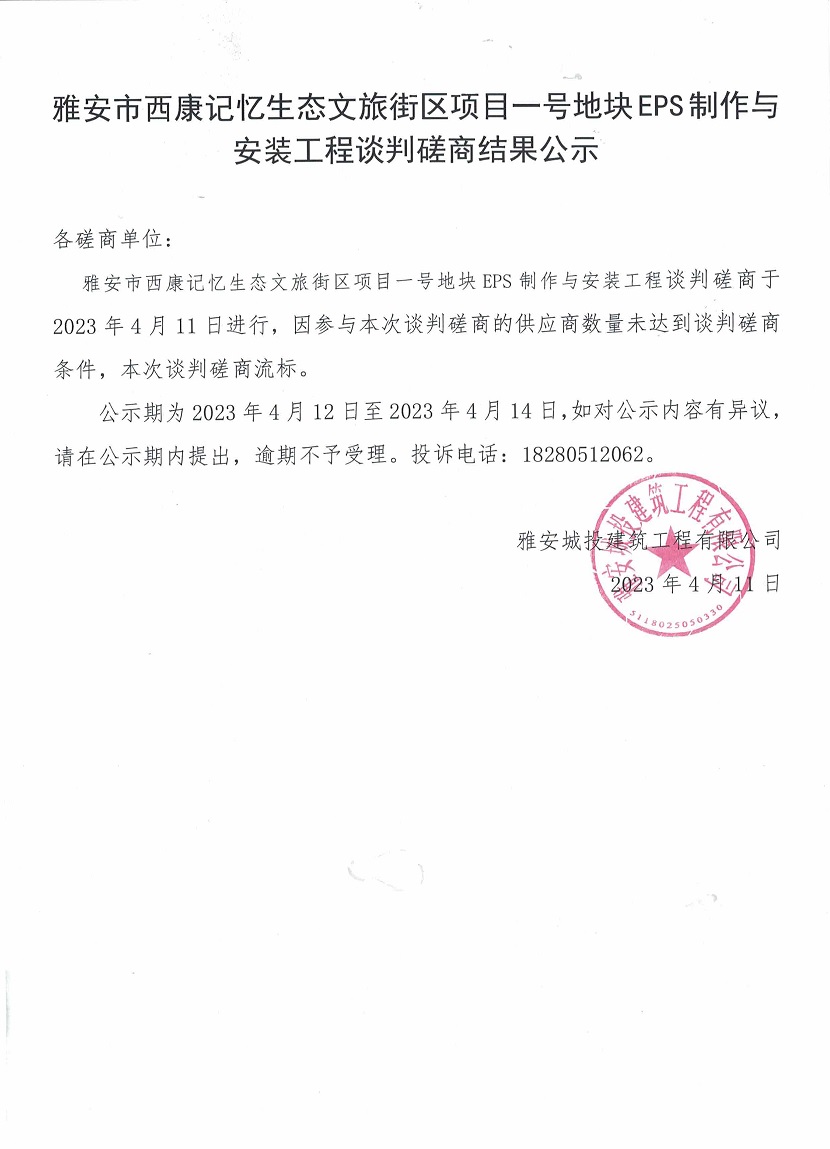 雅安市西康記憶生態(tài)文旅街區(qū)項(xiàng)目一號(hào)地塊EPS制作與安裝工程談判磋商結(jié)果公示