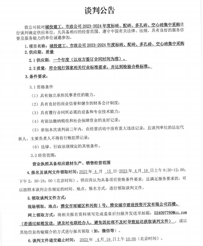 城投建工、市政公司2023-2024年度標(biāo)磚、配磚、多孔磚、空心磚集中采購談判公告