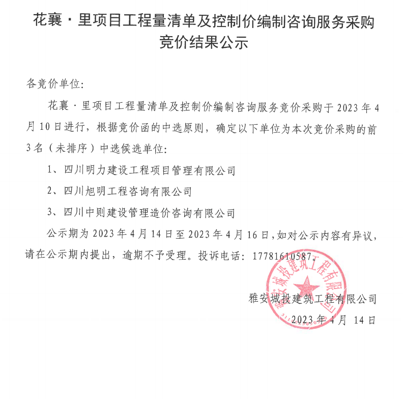 花襄·里項目工程量清單及招標控制價編制咨詢服務采購競價結果公示
