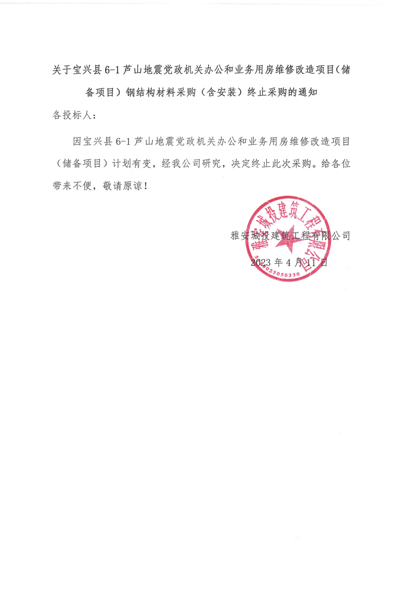 關(guān)于寶興縣6-1蘆山地震黨政機(jī)關(guān)辦公和業(yè)務(wù)用房維修改造項(xiàng)目(儲備項(xiàng)目)鋼結(jié)構(gòu)材料采購(含安裝)終止采購的通知