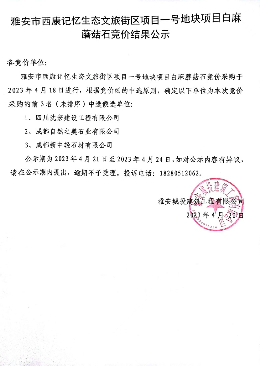 雅安市西康記憶生態(tài)文旅街區(qū)項目一號地塊項目白麻蘑菇石競價結(jié)果公示