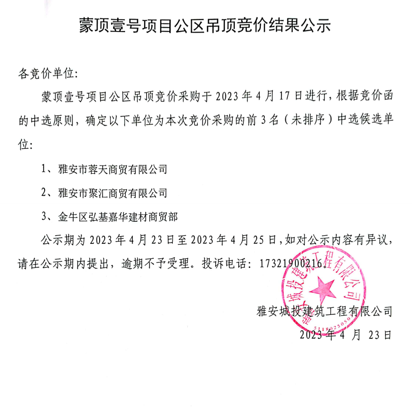 蒙頂壹號項目公區(qū)吊頂競價結果公示