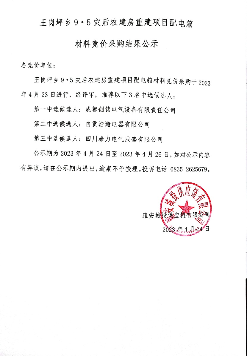 王崗坪鄉(xiāng)9·5災后農建房重建項目配電箱材料競價采購結果公示