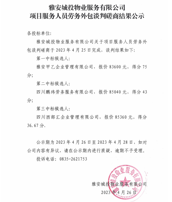 雅安城投物業(yè)服務(wù)有限公司項目服務(wù)人員勞務(wù)外包談判磋商結(jié)果公示