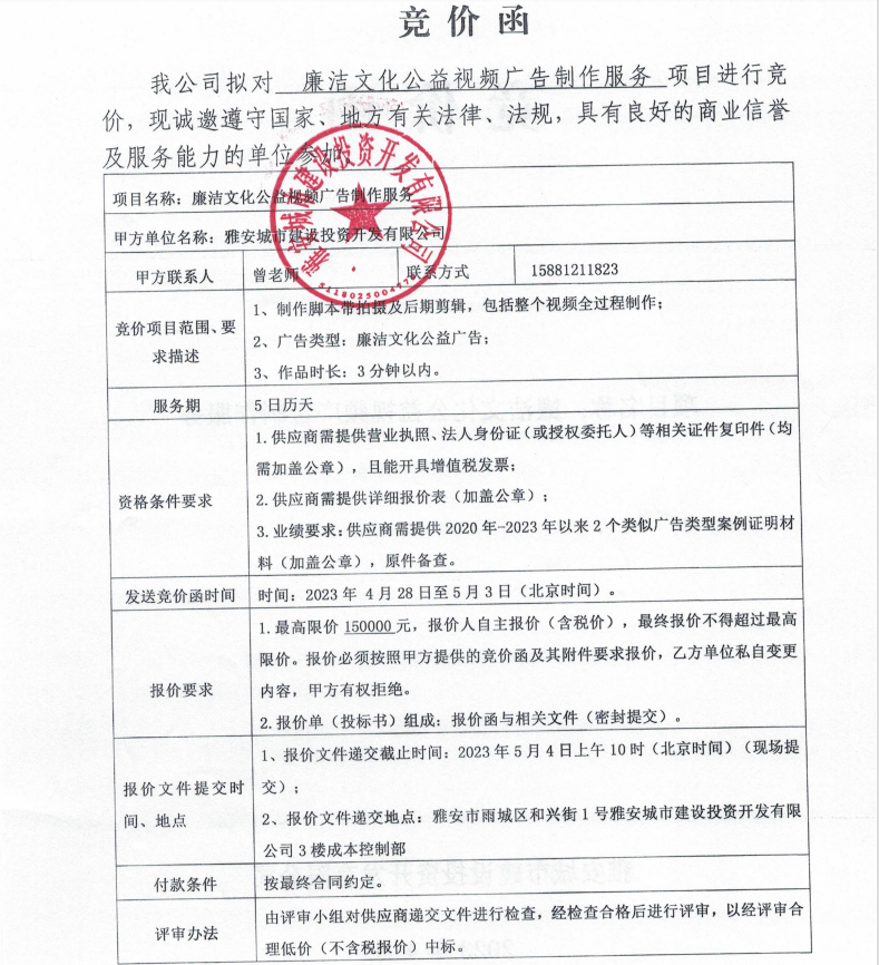 廉潔文化公益視頻廣告制作服務(wù)競價公告