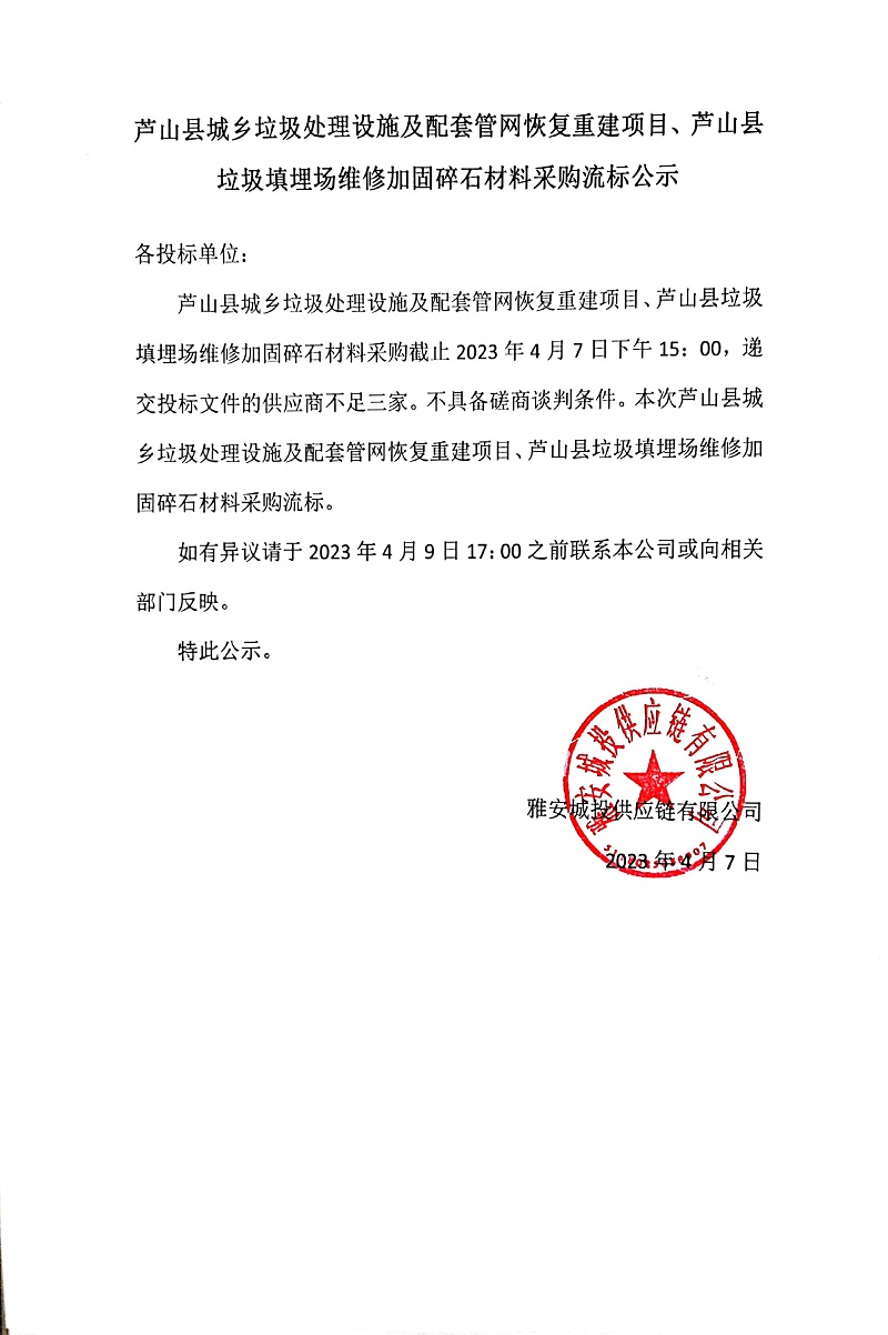 蘆山縣城鄉(xiāng)垃圾處理設(shè)施及配套管網(wǎng)恢復(fù)重建項(xiàng)目、蘆山縣垃圾填埋場(chǎng)維修加固碎石材料采購(gòu)流標(biāo)公示