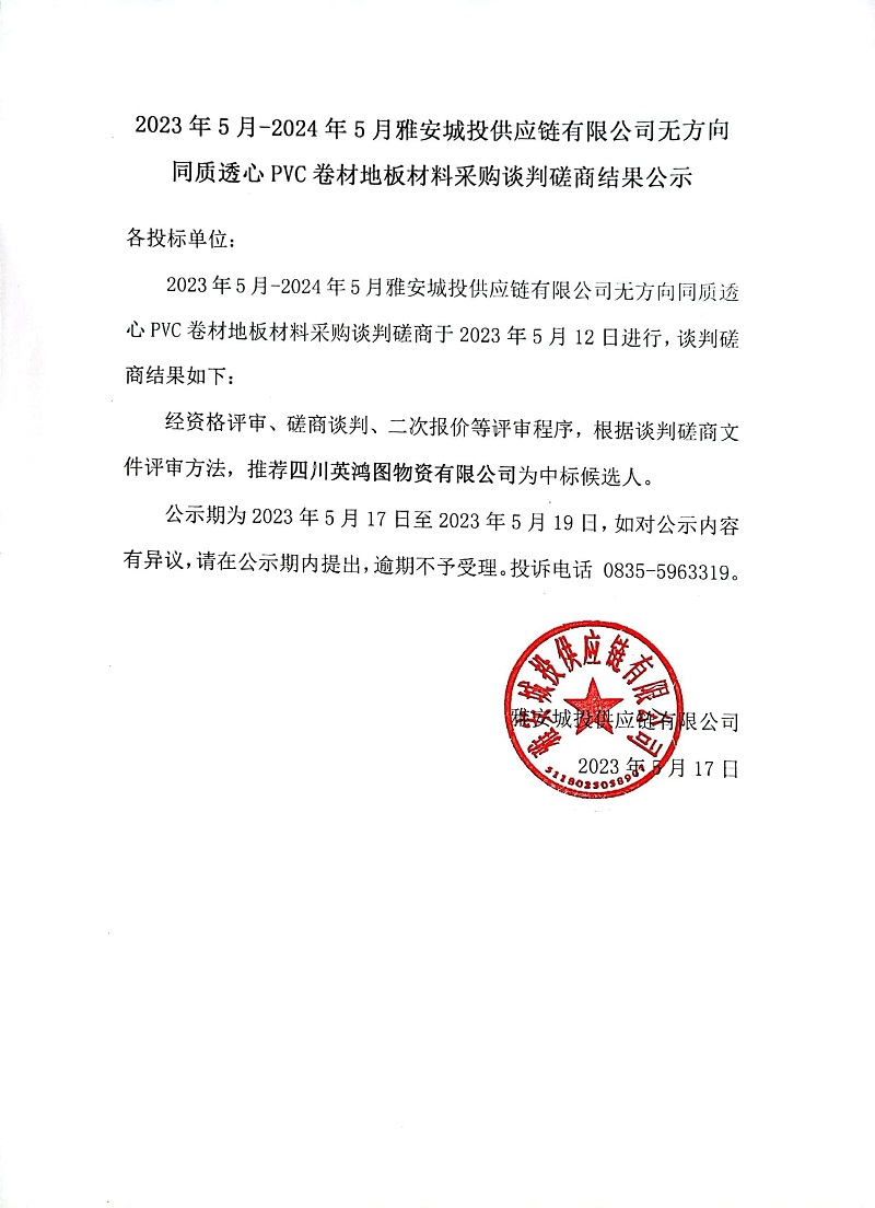 2023年5月-2024年5月雅安城投供應鏈有限公司無方向同質(zhì)透心PVC卷材地板材料采購談判磋商結果公示