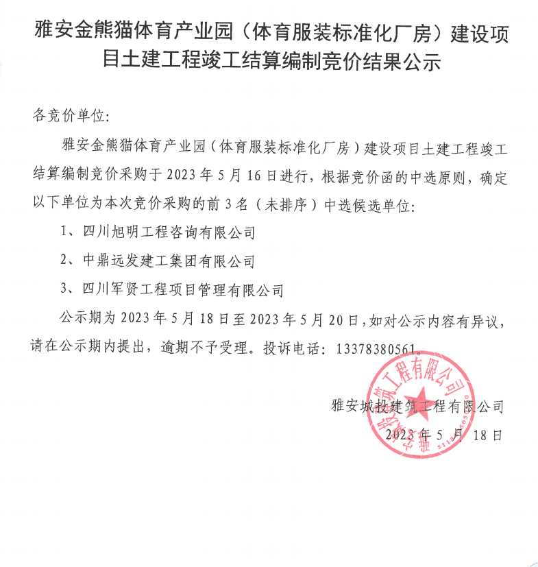 雅安金熊貓體育產(chǎn)業(yè)園(體育服裝標準化廠房)建設(shè)項目土建工程竣工結(jié)算編制競價結(jié)果公示