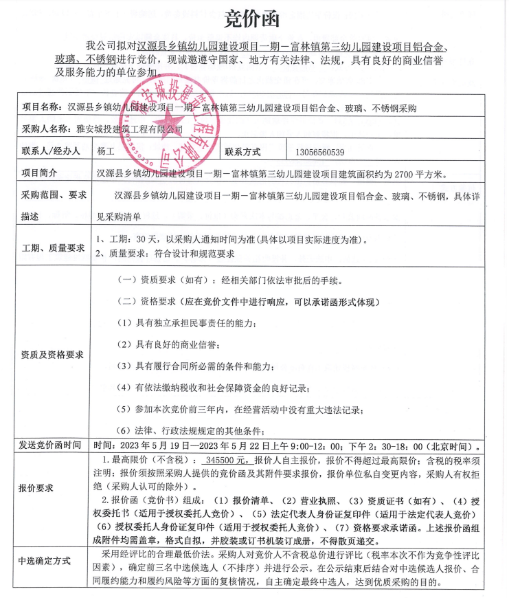 漢源縣鄉(xiāng)鎮(zhèn)幼兒園建設(shè)項(xiàng)目一期一富林鎮(zhèn)第三幼兒園建設(shè)項(xiàng)目鋁合金、玻璃、不銹鋼采購競(jìng)價(jià)公告