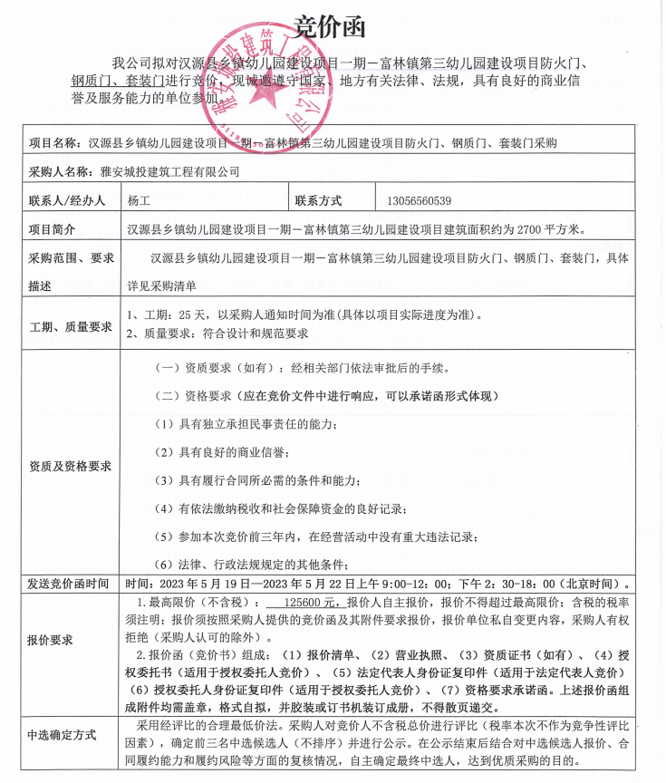漢源縣鄉(xiāng)鎮(zhèn)幼兒園建設(shè)項(xiàng)目一期一富林鎮(zhèn)第三幼兒園建設(shè)項(xiàng)目防火門、鋼質(zhì)門、套裝門采購競價公告