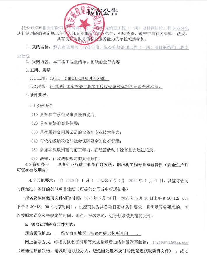 雅安市隴西河(青鼻山段)生態(tài)修復(fù)治理工程(一期)項(xiàng)目鋼結(jié)構(gòu)工程專業(yè)分包談判磋商公告