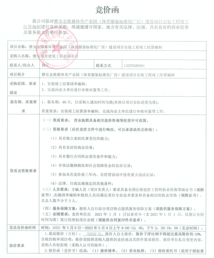 雅安金熊貓體育產業(yè)園(體育服裝標準化廠房)建設項目安裝工程竣工結算編制競價公告