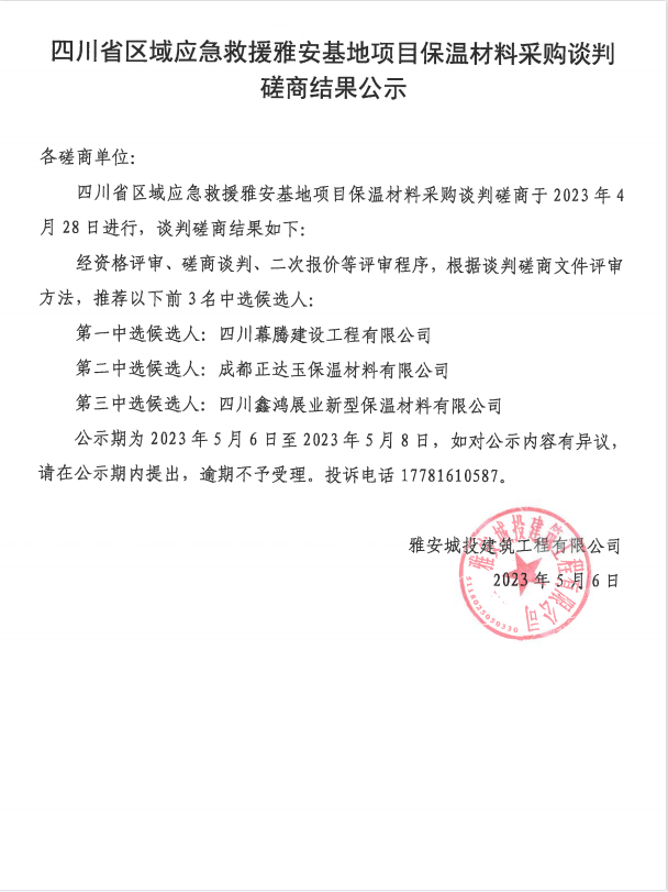 四川省區(qū)域應(yīng)急救援雅安基地項(xiàng)目保溫材料采購談判磋商結(jié)果公示
