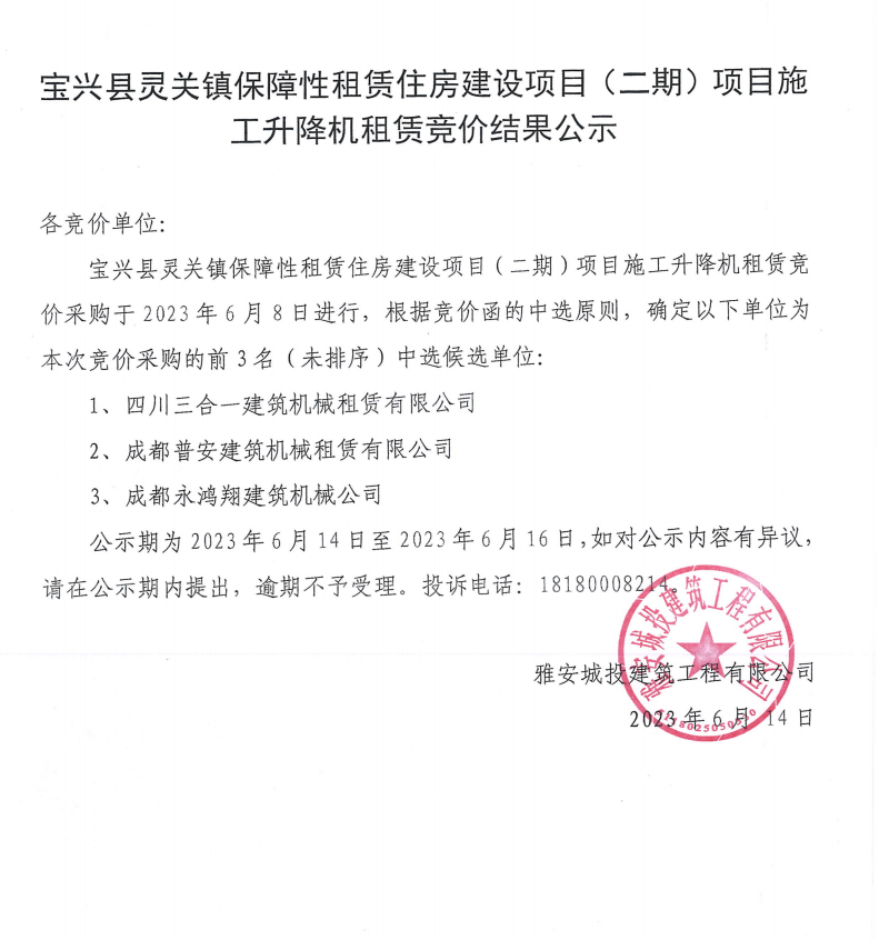 寶興縣靈關(guān)鎮(zhèn)保障性租賃住房建設(shè)項(xiàng)目(二期)項(xiàng)目施工升降機(jī)租賃競(jìng)價(jià)結(jié)果公示