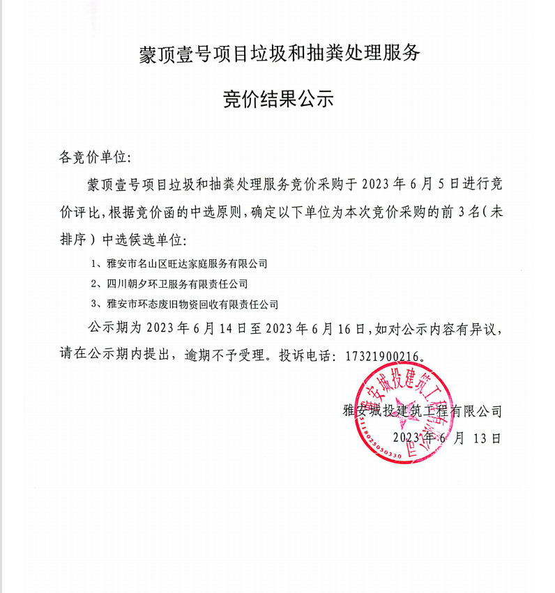 蒙頂壹號(hào)項(xiàng)目垃圾和抽糞處理服務(wù)競(jìng)價(jià)結(jié)果公示