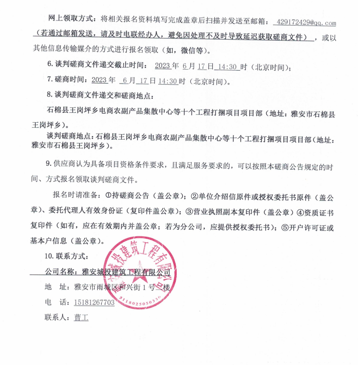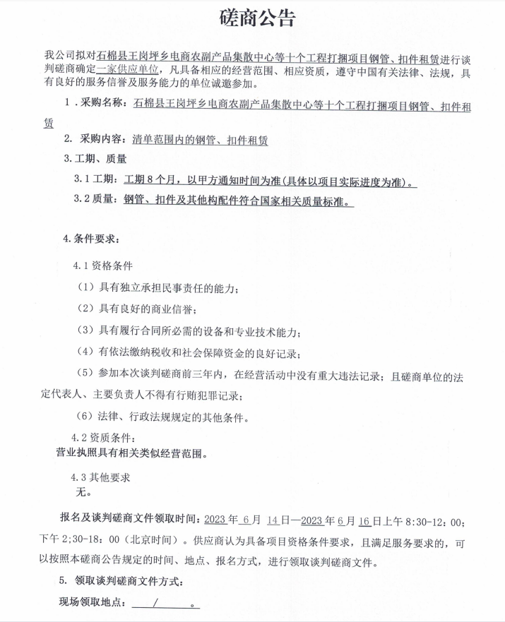 石棉縣王崗坪鄉(xiāng)電商農(nóng)副產(chǎn)品集散中心等十個工程打捆項目鋼管、扣件租賃談判磋商公告