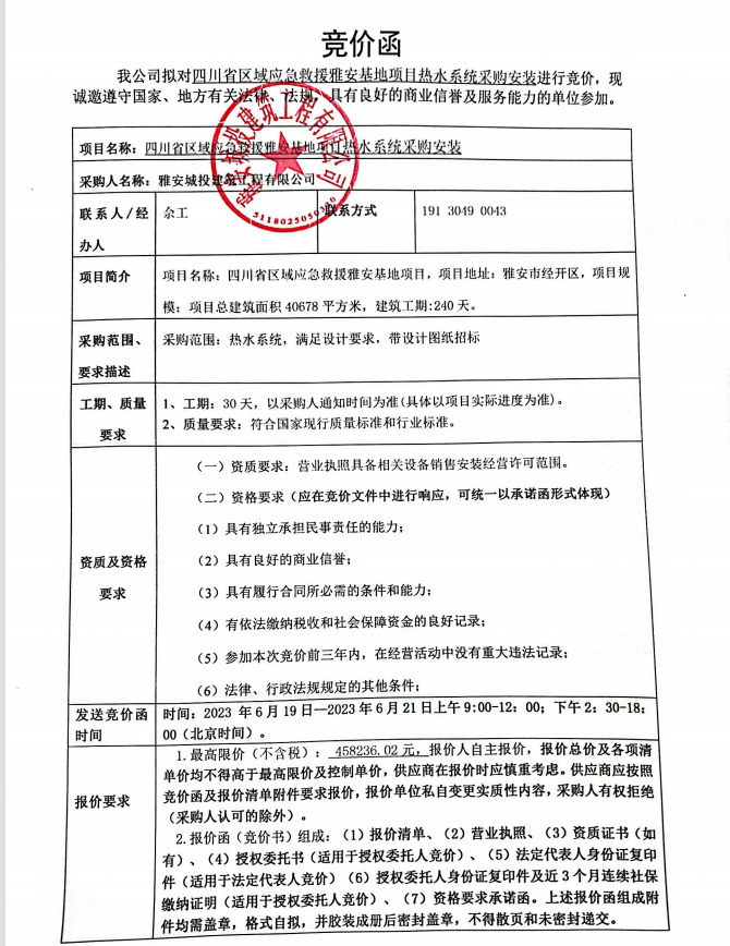 四川省區(qū)域應(yīng)急救援雅安基地項(xiàng)目熱水系統(tǒng)采購(gòu)安裝競(jìng)價(jià)公告