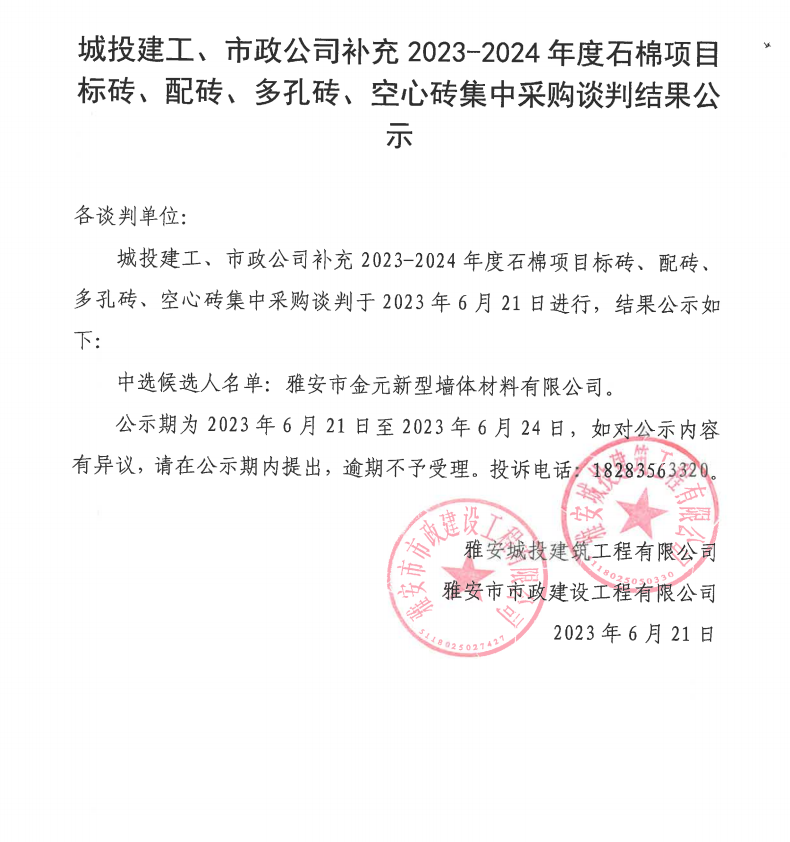 城投建工、市政公司補(bǔ)充2023-2024年度石棉項(xiàng)目標(biāo)磚、配磚、多孔磚、空心磚集中采購(gòu)談判結(jié)果公示