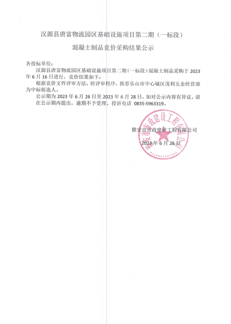 漢源縣唐富物流園區(qū)基礎(chǔ)設(shè)施項(xiàng)目第二期 (一標(biāo)段)混凝土制品采購競(jìng)價(jià)結(jié)果公示