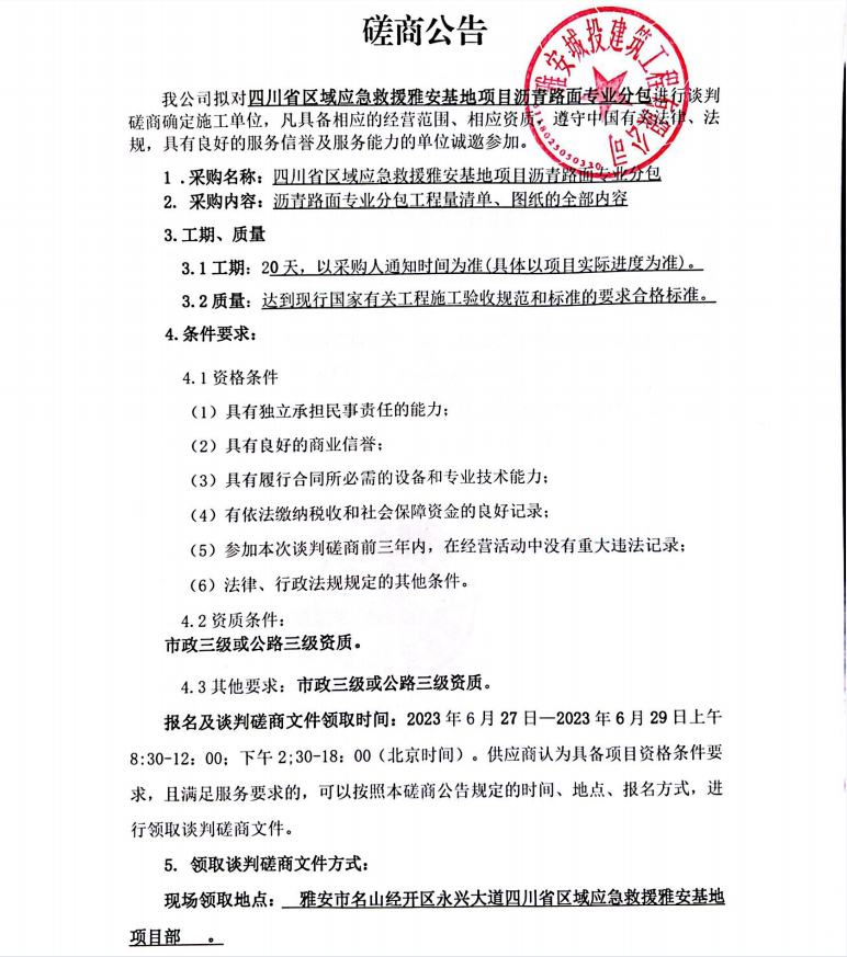 四川省區(qū)域應急救援雅安基地項目瀝青路面專業(yè)分包談判磋商公告