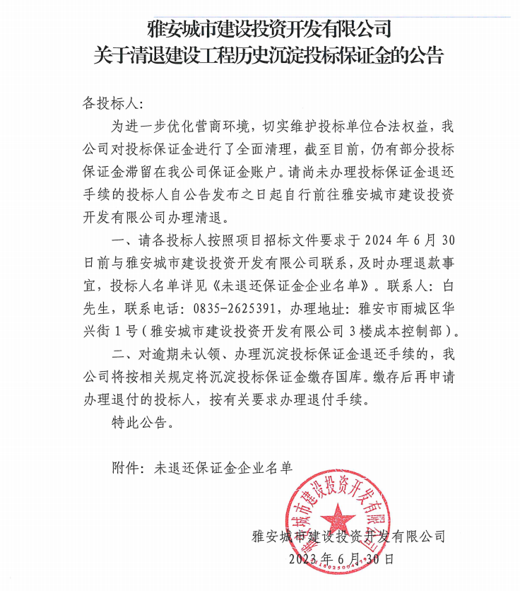雅安城市建設(shè)投資開(kāi)發(fā)有限公司關(guān)于清退建設(shè)工程歷史沉淀投標(biāo)保證金的公告