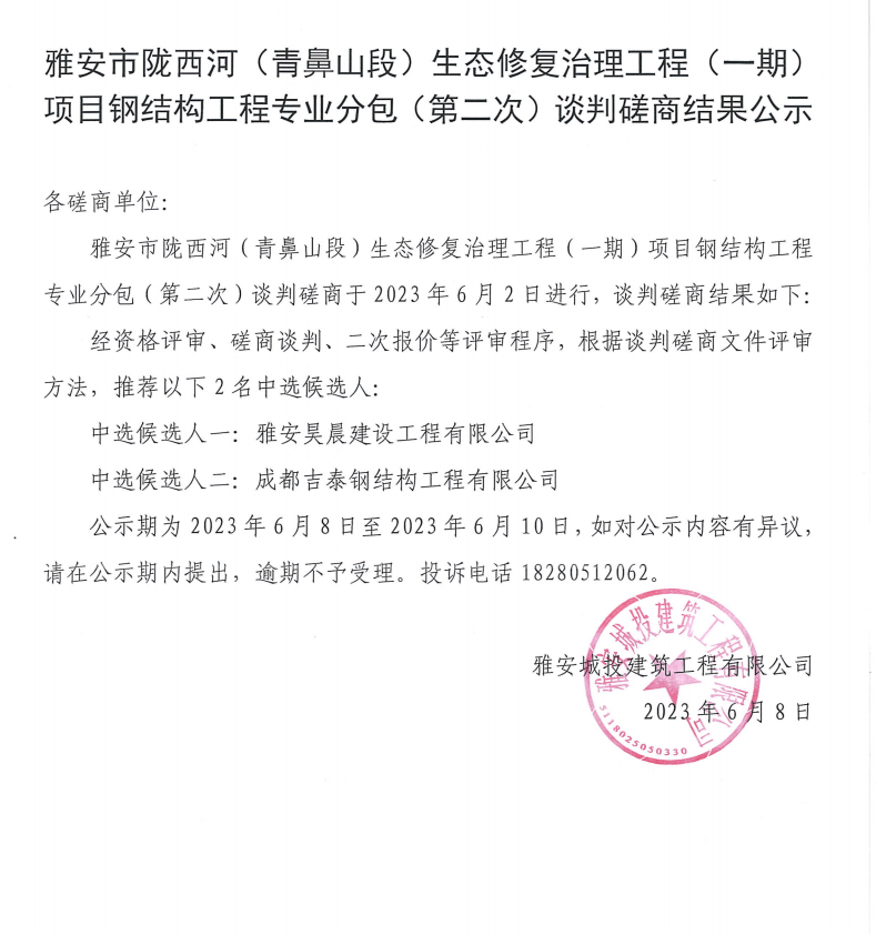 雅安市隴西河(青鼻山段)生態(tài)修復治理工程(一期)項目鋼結構工程專業(yè)分包(第二次)談判磋商結果公示