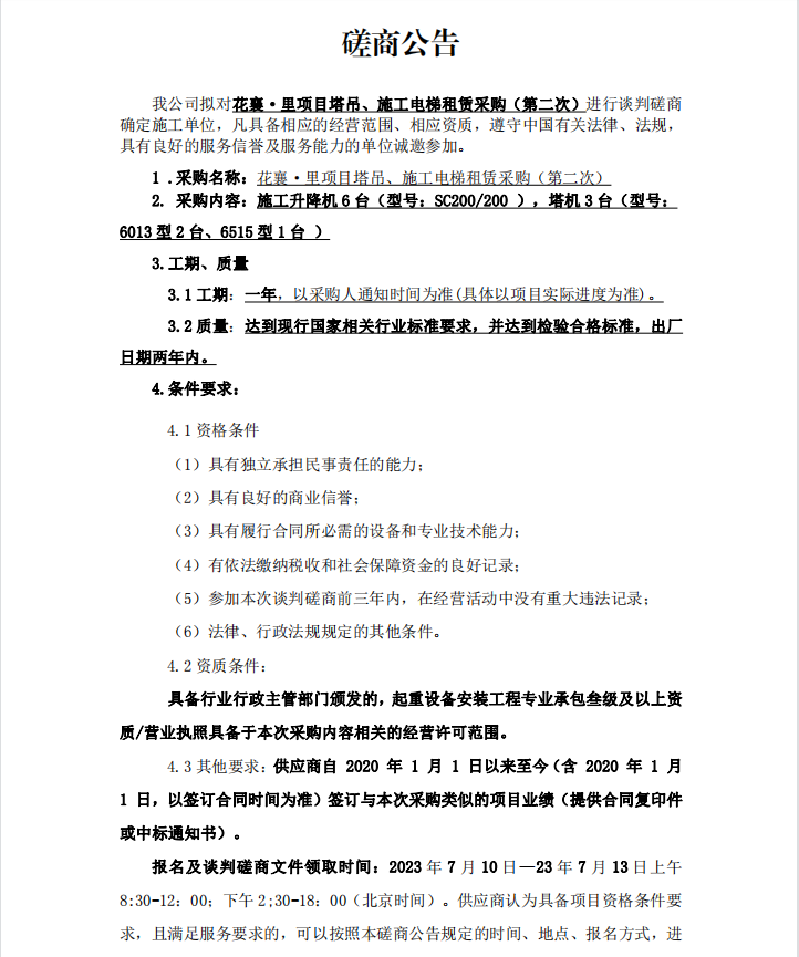 花襄·里項(xiàng)目塔吊、施工電梯租賃采購(第二次)談判磋商公告