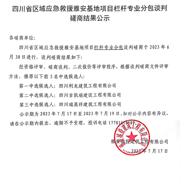 四川省區(qū)域應(yīng)急救援雅安基地項(xiàng)目欄桿專(zhuān)業(yè)分包談判磋商結(jié)果公示