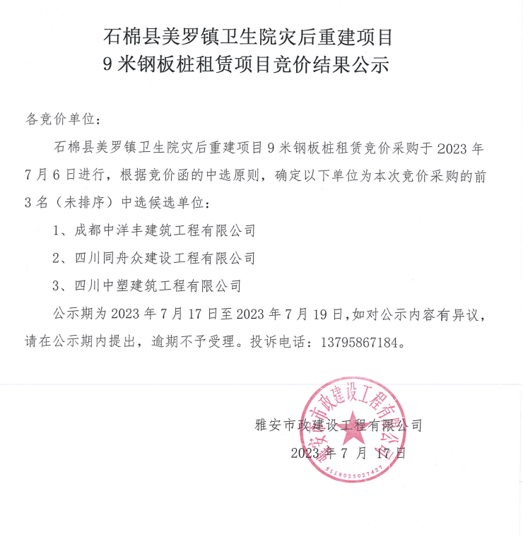 石棉縣美羅鎮(zhèn)衛(wèi)生院災(zāi)后重建項目9米鋼板樁租賃項目競價結(jié)果公示