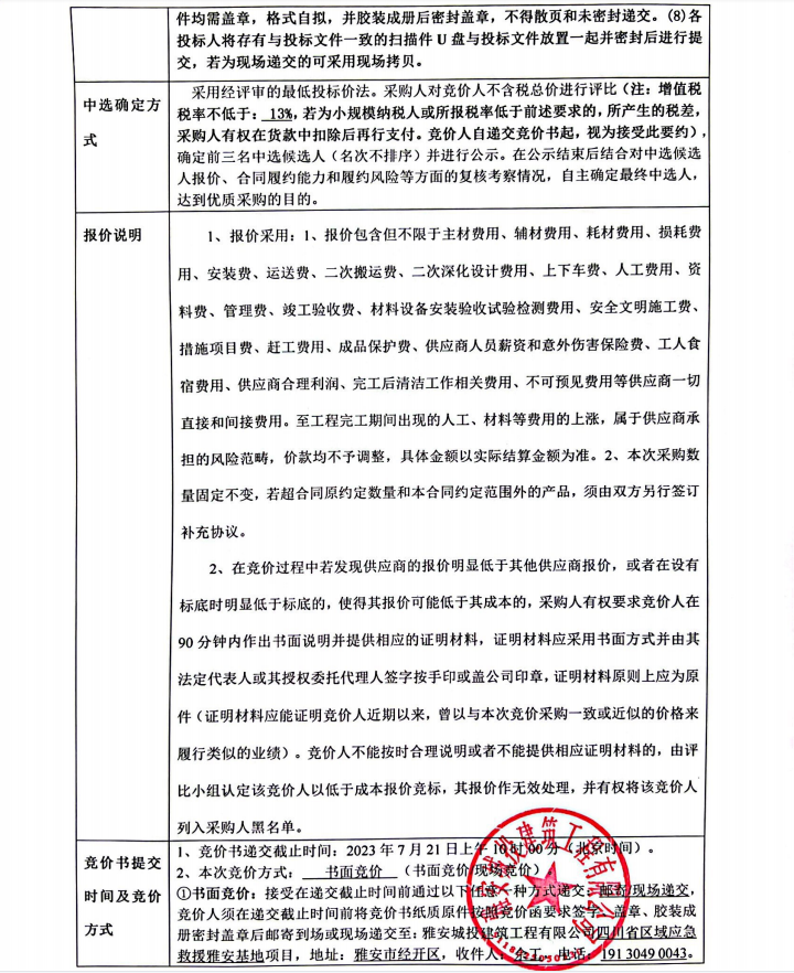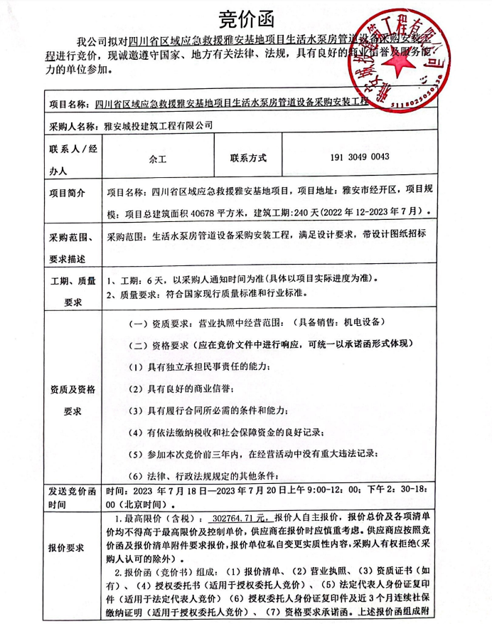 四川省區(qū)域應(yīng)急救援雅安基地項目生活水泵房管道設(shè)備采購安裝工程競價公告