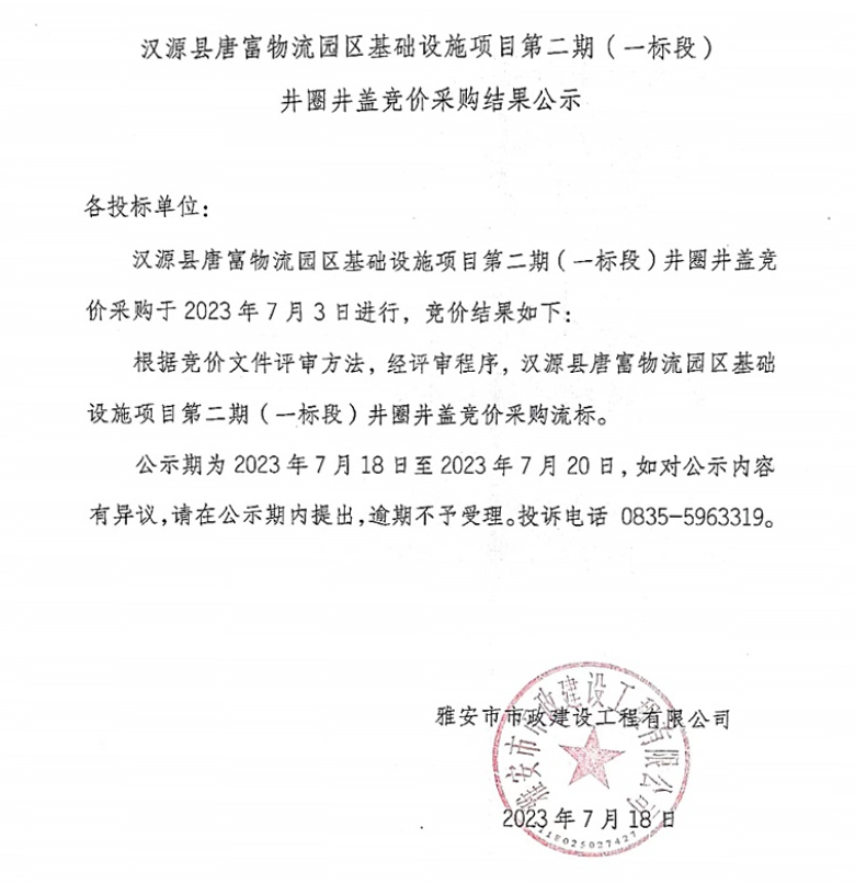 漢源縣唐富物流園區(qū)基礎設施項目第二期(一標段)井圈井蓋競價采購結果公示