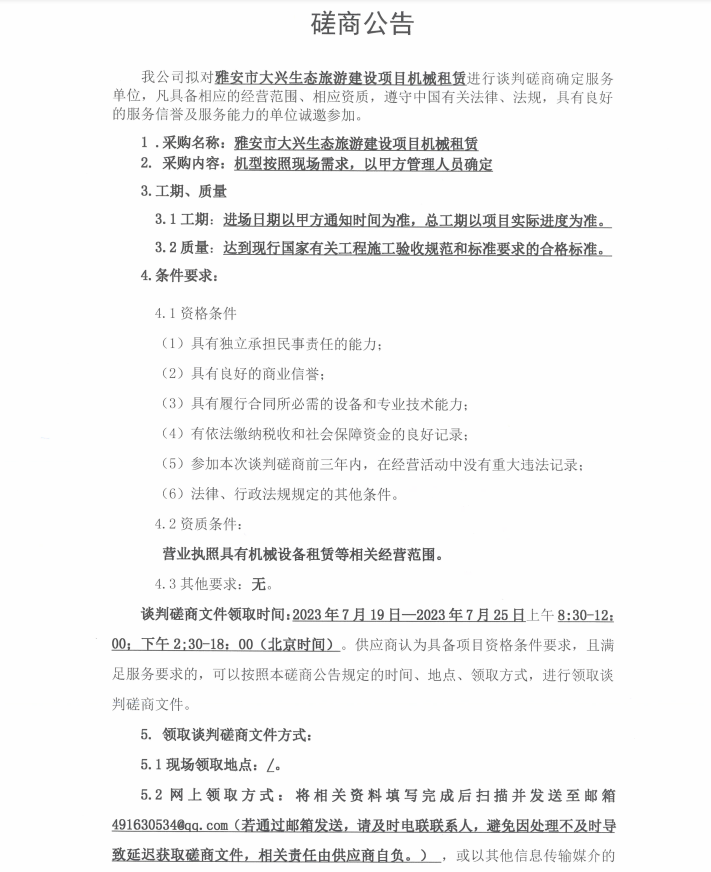雅安市大興生態(tài)旅游建設(shè)項(xiàng)目機(jī)械租賃談判磋商公告