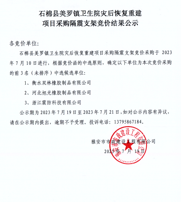 石棉縣美羅鎮(zhèn)衛(wèi)生院災(zāi)后恢復(fù)重建項(xiàng)目采購隔震支架競(jìng)價(jià)結(jié)果公示