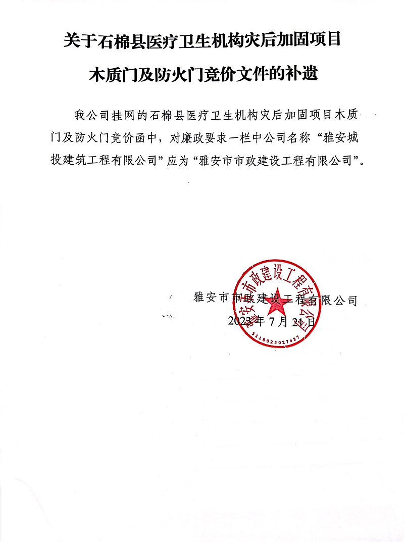 關(guān)于石棉縣醫(yī)療衛(wèi)生機(jī)構(gòu)災(zāi)后加固項(xiàng)目木質(zhì)門及防火門競(jìng)價(jià)文件的補(bǔ)遺