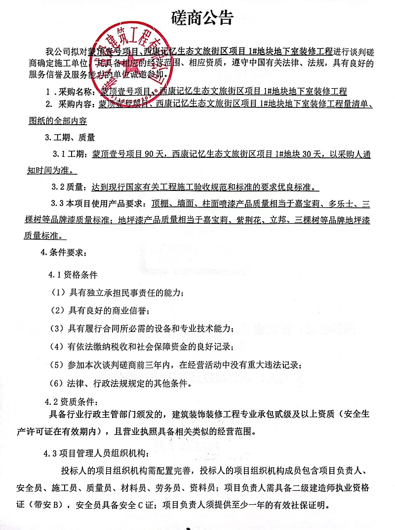 蒙頂壹號(hào)項(xiàng)目、西康記憶生態(tài)文旅街區(qū)項(xiàng)目1#地塊地下室裝修工程談判磋商公告
