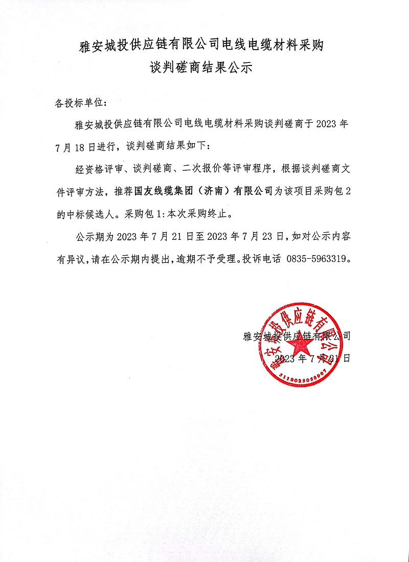 雅安城投供應(yīng)鏈有限公司電線(xiàn)電纜材料采購(gòu)談判磋商結(jié)果公示