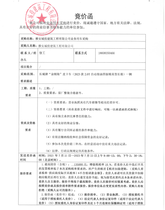 雅安城投建筑工程有限公司業(yè)務(wù)用車采購(gòu)競(jìng)價(jià)公告