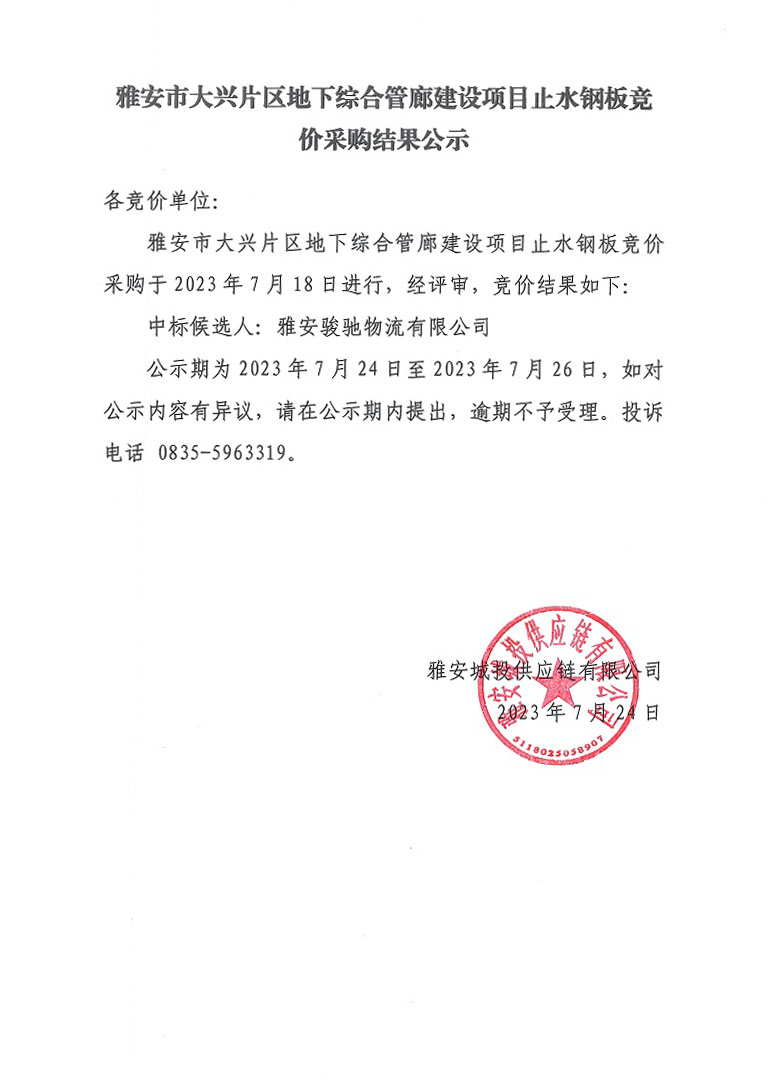 雅安市大興片區(qū)地下綜合管廊建設(shè)項目止水鋼板競價采購結(jié)果公示