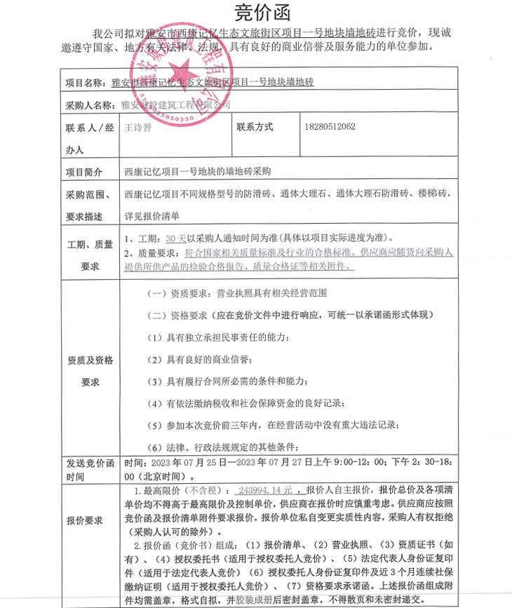 雅安市雅安市西康記憶生態(tài)文旅街區(qū)項(xiàng)目一號地塊墻地磚競價采購公告