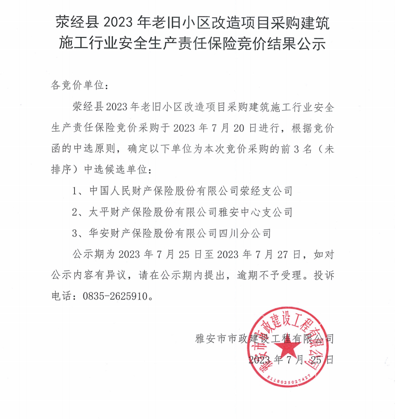 滎經(jīng)縣2023年老舊小區(qū)改造項(xiàng)目采購建筑施工行業(yè)安全生產(chǎn)責(zé)任保險(xiǎn)競價(jià)結(jié)果公示