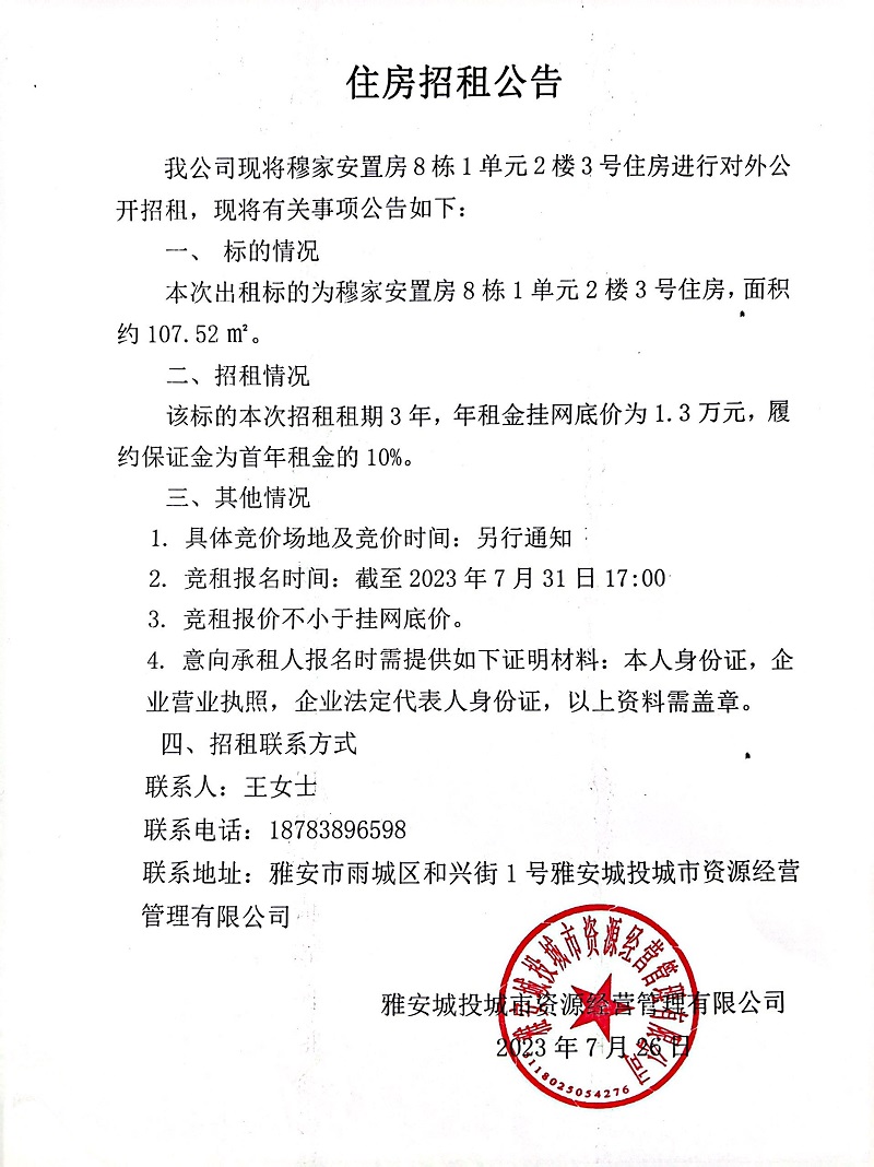 穆家安置房8棟1單元2樓3號住房招租公告