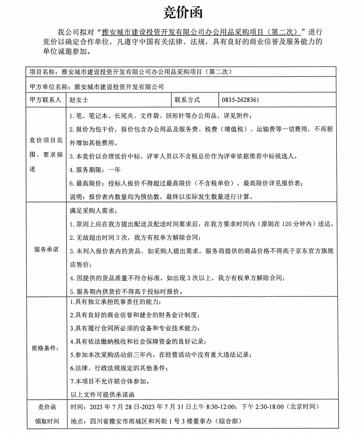 雅安城市建設(shè)投資開發(fā)有限公司辦公用品采購(gòu)項(xiàng)目(第二次)競(jìng)價(jià)公告