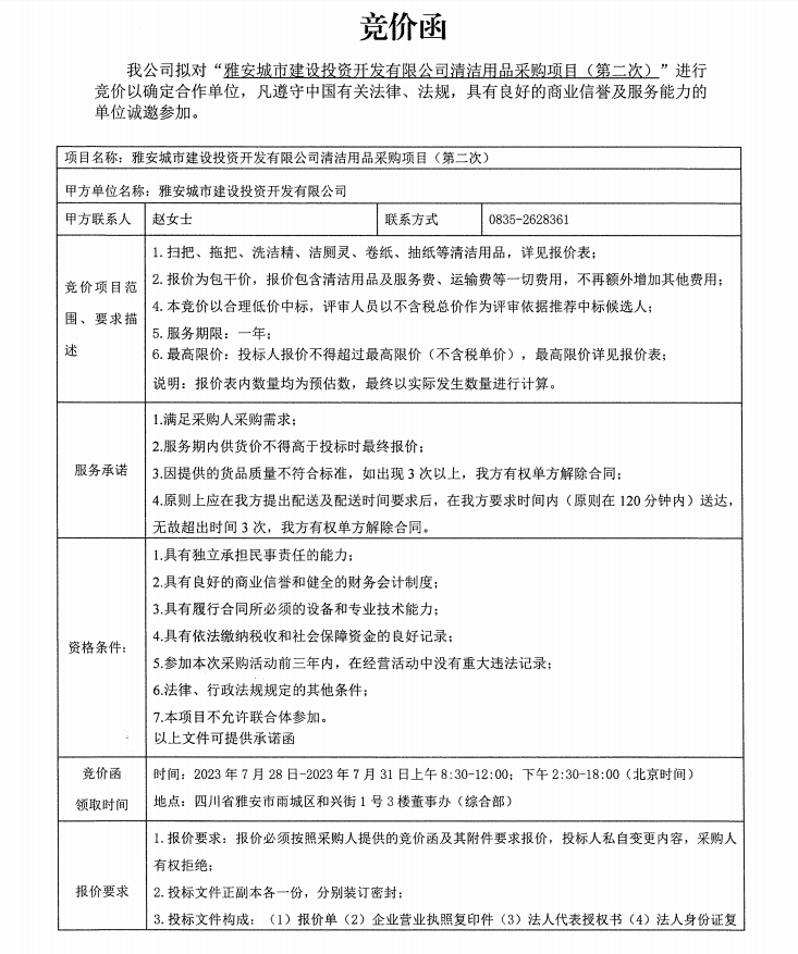 雅安城市建設(shè)投資開(kāi)發(fā)有限公司清潔用品采購(gòu)項(xiàng)目(第二次)競(jìng)價(jià)公告