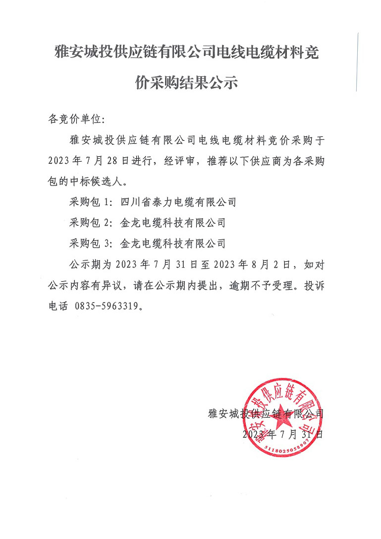 雅安城投供應(yīng)鏈有限公司電線電纜材料競價采購結(jié)果公示