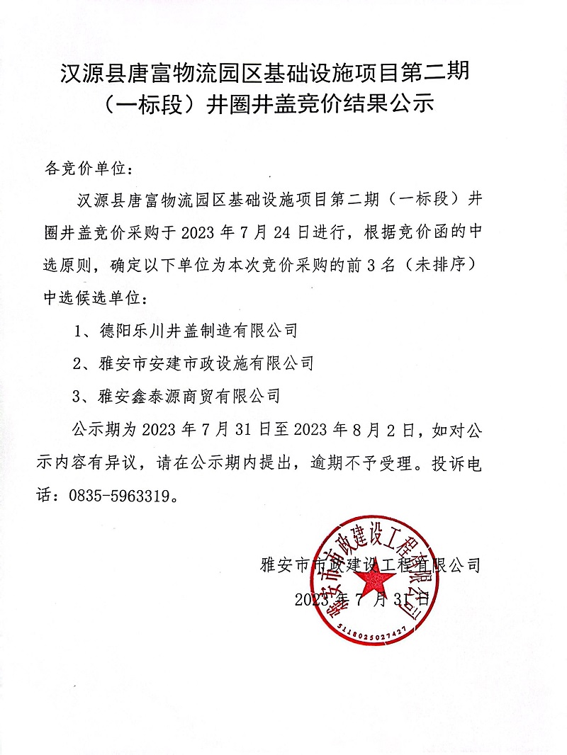 漢源縣唐富物流園區(qū)基礎設施項目第二期(一標段)井圈井蓋采購競價結果公示