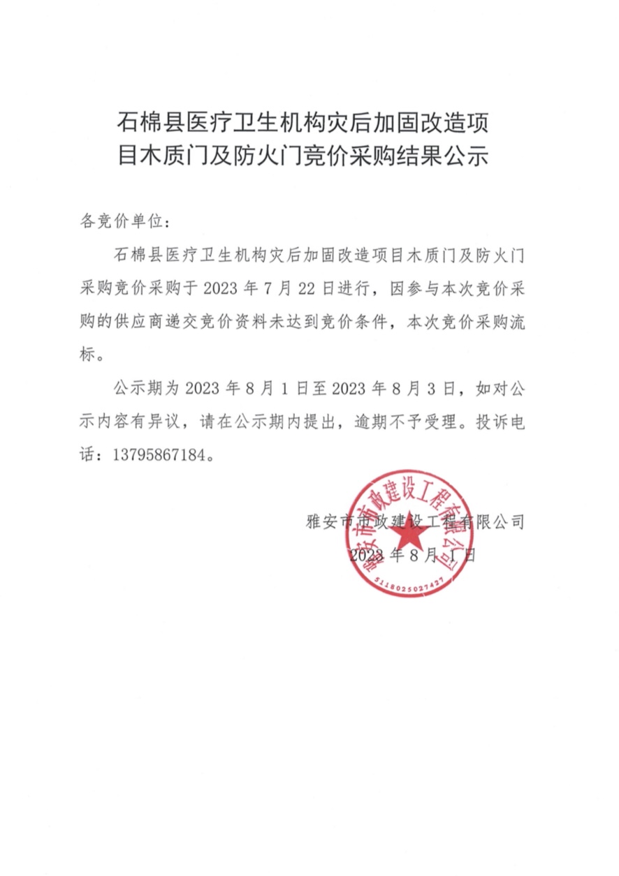 石棉縣醫(yī)療衛(wèi)生機構(gòu)災(zāi)后加固改造項目木質(zhì)門及防火門競價采購結(jié)果公示