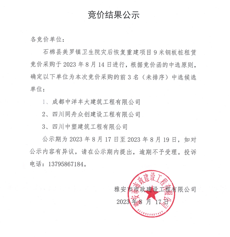 石棉縣美羅鎮(zhèn)衛(wèi)生院災(zāi)后恢復(fù)重建項(xiàng)目9米鋼板樁租賃競(jìng)價(jià)結(jié)果公示