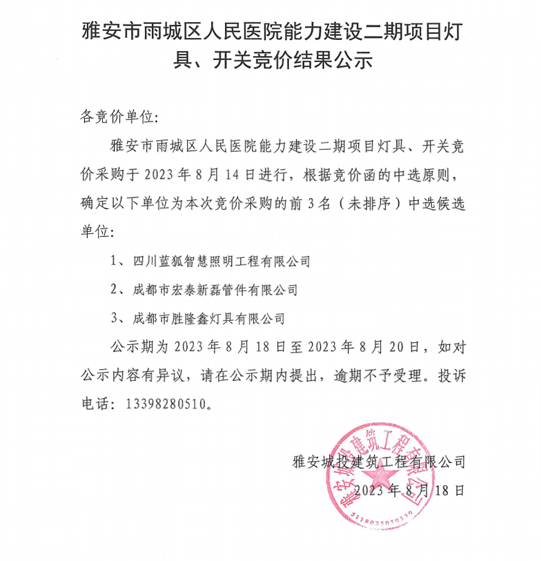 雅安市雨城區(qū)人民醫(yī)院能力建設(shè)二期項(xiàng)目燈具、開關(guān)競(jìng)價(jià)結(jié)果公示