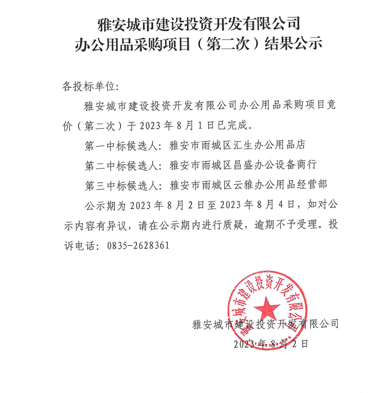 雅安城市建設(shè)投資開發(fā)有限公司辦公用品采購項(xiàng)目(第二次)結(jié)果公示